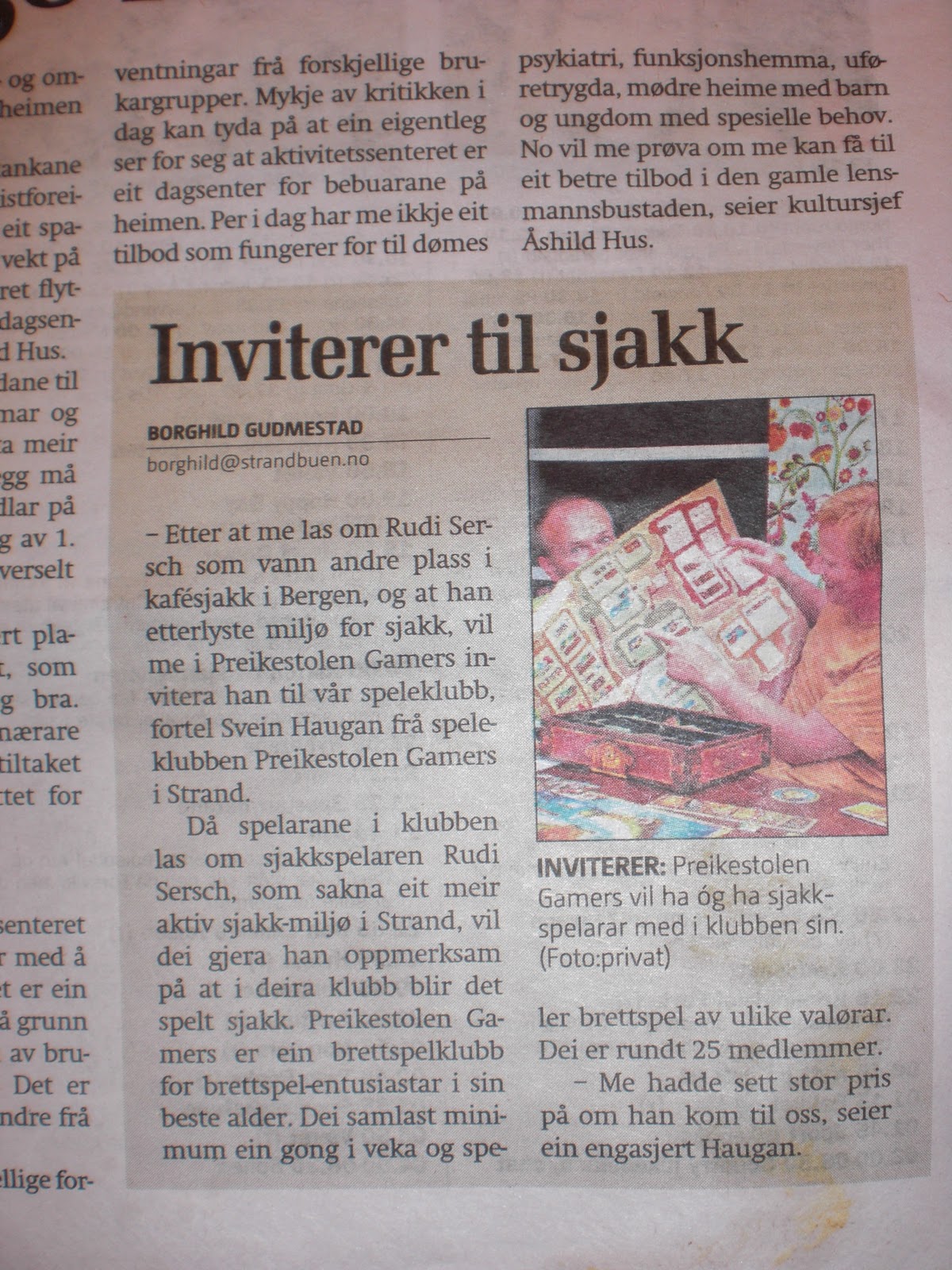 Preikestolen Gamers har invitert det lokale sjakkfenomet Rudi Sersch for samarbeid. Han hadde ifølge lokalavisen Strandbuen etterlyst et større sjakkmiljø. Tidligere har han drevet med sjakkopplæring i skolesammenhang. PG med mange eks-sjakkspillere på medlemlisten reagerte på avisens etterlysning og inviterte Rudi til å komme. I dag deltok PG-styret med både formann Main og sekretær Hollender, og medlemmene Aart og Olav i speiderens fellestur. Ved speiderhytta fikk de æren til å møte sjakkmesteren som gjerne ville komme til PG og spille simultansjakk mot PG’s medlemmer. Simultansjakk reduserer tenketiden for alle (om han hadde hørt PGs rykte?). Etterpå kommer det garanter moderne brettspill på bordet! PG er og blir jo en brettspillklubb.![]() |