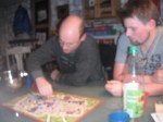 André takket for seg men lovte å komme igjen, mens Vegard og Sveinmain tok en runde vanlig Ubongo mens vi ventet på Big City gjengen. Vegard kom best igang selv om det ble en del blanke omganger på oss begge. Orginalutgaven av ubongo er nok den beste, med tette oppgjør selv med kun 2 spillere. Duellutgaven er nok tettere, men egner seg best på dagtid på uthvilte hjerner. Men det ble duell nok med orginalen og nærmest slossing om brikkene. Tilslutt måtte vi avslutte da BigCitygutta var ferdige. Sveinmain vant 5 mot Vegards 3 diamanter i en og samme farge. Blir nok flere dueller når dødtiden melder seg. Kjekt!!!