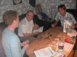 Så var det duket for kveldens hovedrett: Order of the Stick, bygd på en tegneserie av samme navn. Her skulle 3 helter gå ned i en gruve i 4 etasjer og bekjempe monstre. Klarte en det fikk en litt drahjelp til å bli en enda bedre monsterbekjemper. Ble en del terningtrilling i slike spill som det bruker å være, men vi 3 heltene holdt motet oppe og kjempet og kjempet. Flotte illustrasjoner og tøffe monstre gjorde jobben vanskelig, selv med iherdig innsats. Men vi gav oss ikke før André ble kalt hjem av kona. Da hadde 3 timer fløyet av gårde og selv med et siste heroisk slag klarte vi aldri å nå sluttmønsteret. Men neste gang, da skal vi vinne….