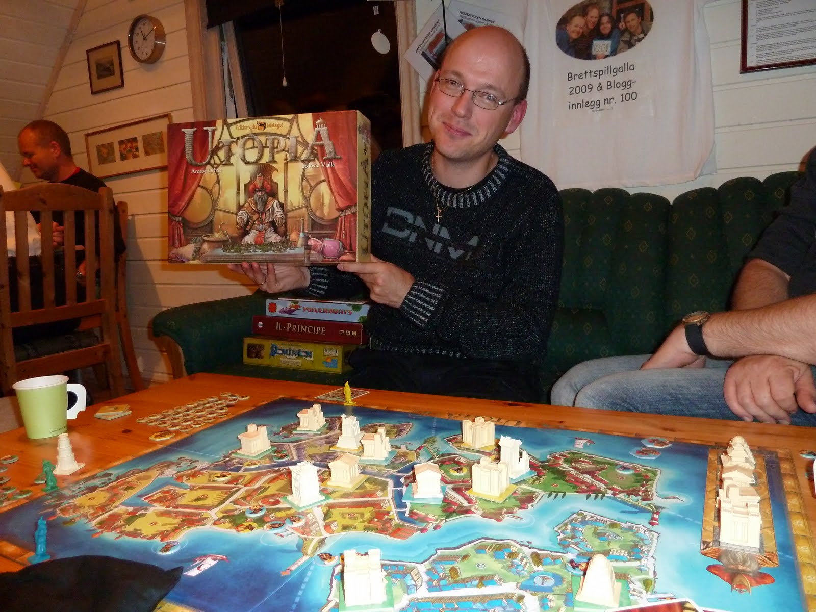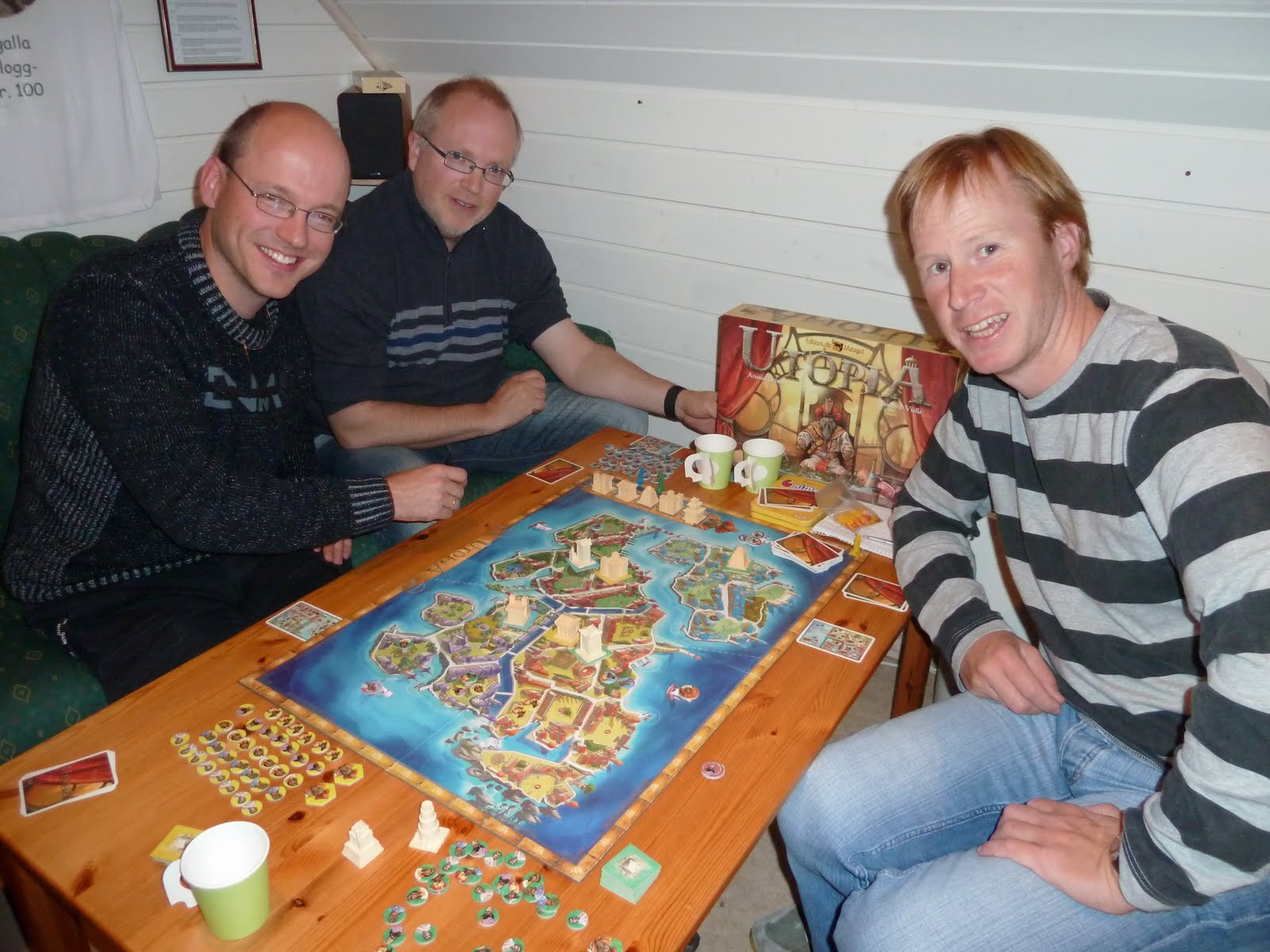 Hollender foreslo å teste ut det nyinnkjøpte Funkenschlag kartet Kina/Korea. Sveinmain sa høflig NoThanks og forslo Utopia i stedet, da det var rimelig utopisk at han frivillig skulle bli med på Funkennicht. Utopia ble det, og Innante og Peter ble med. Utopia er utseendemessig et spill i det ypperste toppskiktet, og spillemessig er det enkle regler, men likevel utfordrende nok for en god gjennomspilling. Kongeriket Utopia skal utbygges og det kommer byggherrer fra de 5 store folkeslagene Persere, Mayaene, Grekere, Egypterne og Kinesere. Du som formann i arbeidslaget på øya skal ansette de du velger og når visse kombinasjoner er oppnådd kan du bygge byggverk. Lederen får litt mer handicap enn de andre da det er en fordel og velge byggherrer først. Poeng gis på en flytende skala som spillerne kan påvirke ut i fra hvilket bygg som er mest verdt, og som den som ligger sist har mest innflytelse på. Innante dro i fra og innkasserte poeng allerede fra første runde, og fikk en solid ledelse som Sveinmain og Peter aldri klarte å ta igjen. Istedet ble det en kamp i kampen som Peter liker, men denne gangen klarte Sveinmain å holde han bak seg og kunne med det sikre andreplassen. 1. Innante50+poeng 2.Sveinmain 35 poeng 3. Peter 29 poeng.