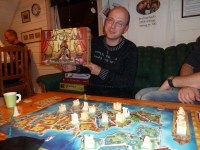 Til slutt var det Elasund. Et spill som jeg har hatt liggende i skapet lenge. PG-sympathisant Kåre Dyvik forklarte både regelene og viktige taktiske betraktelser. Kim fra Skien (og Stavanger?) var den tredje spilleren rundt bordet. Spillets mekanikk var nokså enkelt og et lite kort gav en god oversikt over fasene. Etter noen runder begynte å bli trangt på brettet, og det første plageriet startet. Ingen gav hverandre presanger og prisen for å kjøpe hverandres byggetillatelser var høy. Heldigvis kom det nok gull i spillet. Bygg ble overbygd og dermed mistet man viktige poeng. Etter en time kunne jeg sette min siste mann på brettet, like før Kin og Kåre hadde klart det. Kåre og Kim lovde å komme innom PG på kort sikt.