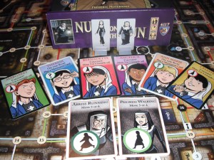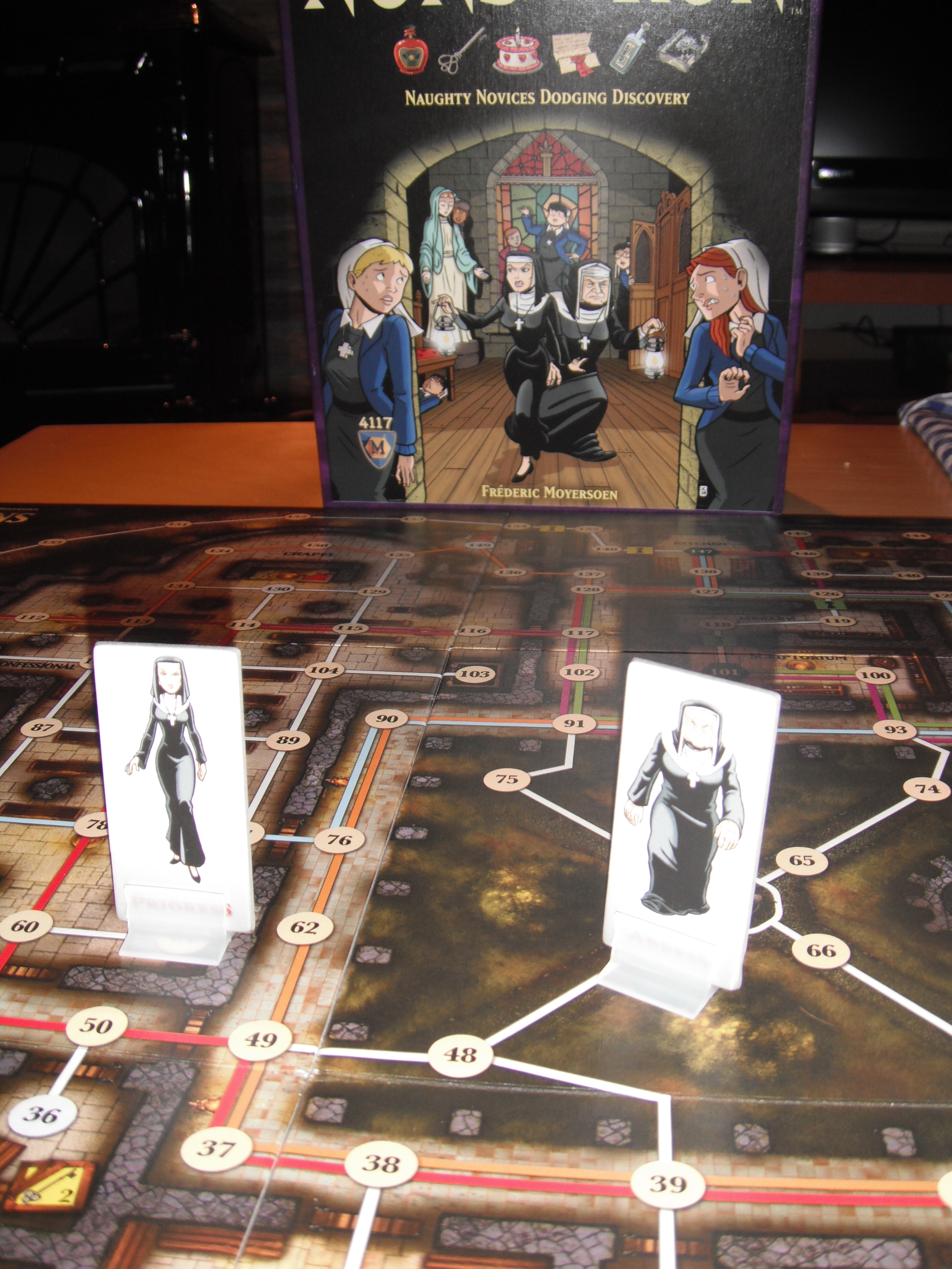 mte ruter og oppdager de at nonnene er på flukt vil disse springe etter å fange de. Alstå et meget kjekt tema. Spillmekanikken kan minne om Scotland yard, men motsatt. Det morsomste i Scotland yard er å være mr. x. I nuns on the run er alle Mr. x bortsett fra den som styrer abbedussene. Og forskjellen er også at her kåres det EN vinner, istedet for at alle vinner og en taper. Kartet er også mindre og konfrontasjonene større. Det hele begynte med at Peter ble oppdaget da han prøvde å hente sin nøkkel. På grunn av litt regelvirvarr så fikk han stikke av uten å bli tatt av abbedussene. Etterhvert hørte abbedussene lyden av både Drproktor og Black ant. Men de klarte å snike seg unna uten å bli sett, men måtte ta noen omveier for å kunne hente sitt hemmelige oppdrag. På vei tilbake til klostercella si gjorde Peter en skikkelig bommert og ble oppdaget rett i det han skulle vinne hele greia, og ble tatt. På grunn av dette klarte Black ant og Drproktor og fullføre samtidig, og siden ingen av de hadde blitt tatt før fikk de dele seieren og det i 12. runde. 1. Black ant og Drproktor. Nuns on the run ble godt mottatt rundt bordet, og var morsomt å spille. 1. gjennomspilling gikk unna på en drøy time. Vil nok få ned spilletiden etterhvert som reglene sitter bedre. Anbefales!