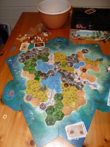 Så var det duket for hovedretten; Colosseum. En eske proppfull av stasj, med noe av de flotteste brikkene jeg i allefall har sett, alt hadde hver sin plass i boksen, så det gikk kjapt å få stilt det opp selv med mye utstyr. Så var det bare å sette igang. 5 intense runder hvor det gjelder å dra tilskuere og Ceasar og hans priviligerte venner til din arena for å se Gladiatorer kjempe, folk syne og hester og løver i bur. Spillmekanikken er ikke helt ulik et annen Days of Wonder-spill, Cleopatra. I Colosseum gjaldt det først å utvide stadioen, selge sesongkort eller skaffe seg et show. Så gjaldt det å by på utstyr til showet ditt som økte i takt med størrelsen på arenaen, og som i tillegg gav mer og mer seierspoeng. Så kunne en bytte utstyr, før en kjørte show, flyttet senatorer og telte poeng. 5 runder gikk rimelig kjapt unna selv om det var vanskelig å planlegge fremtidige trekk. Med 3 spillere ble det heller ikke den store prispressingen på auksjoner da det var mye spredning i hvilke show en ville kjøre, og lite konkurranse om artistene. Men moro var det likevel, og topp kvalitet på brikker og brett så følte en nesten en hadde vært i Colosseum etter 1,5 timer spilling. Kjekt, engasjerende og ikke alt for komplisert spill!