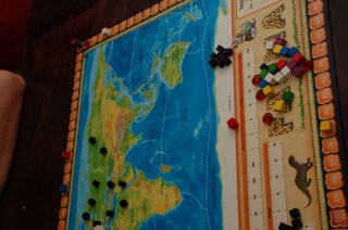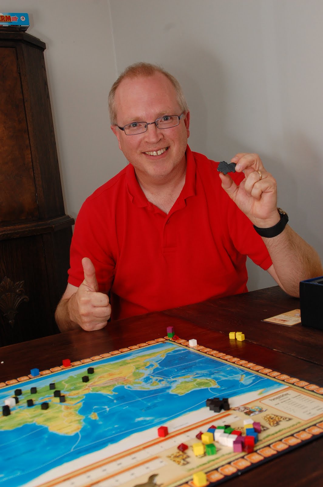 Spillet Thurn and Taxis var et nytt spill for meg, og ikke spilt så mye av Hollender så det måtte en regellesing før spillet kunne starte. Etter en rask regelforklaring, startet jeg etter reglene som yngste spiller. Målet i spillet er å sette opp postruter i Bayern og omliggende distrikt. Man må sette opp korte ruter før en gradvis bygge seg opp, slik at man minst lager 5 post ruter hver, hvis alle klarer det? Jo lengre ruter jo vanskeligere blir det også på grunn av at man vil skaffe seg regionspoeng når regionene begynner å fylle seg opp. Spillet er litt statisk i begynnelsen men trenger mer planlegging utover i spillet. Hollender kom raskt igang og stakk av med alle de lengste rutene først og fikk igjen mer poeng for det. Jeg selv slet litt med kortene som kom opp og brukte mange handlinger på å bytte kort. Men fikk sanket en del regionspoeng istedenfor.