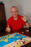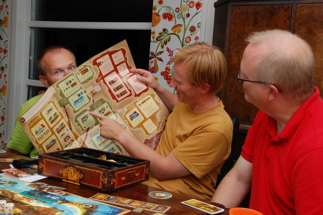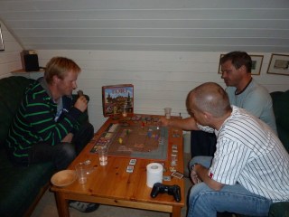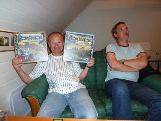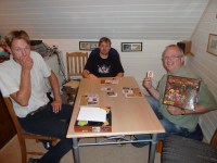 Når runden var over dukket Svein opp på døren for å slå av en prat og med en bag med spill (bytte varer). Peter dukket også opp etter lit leting etter spilllokalet. Vi ble enige om, siden vi nå hadde funnet ut vi spillte litt feil første runde, å ta en runde Thurn and Taxis.