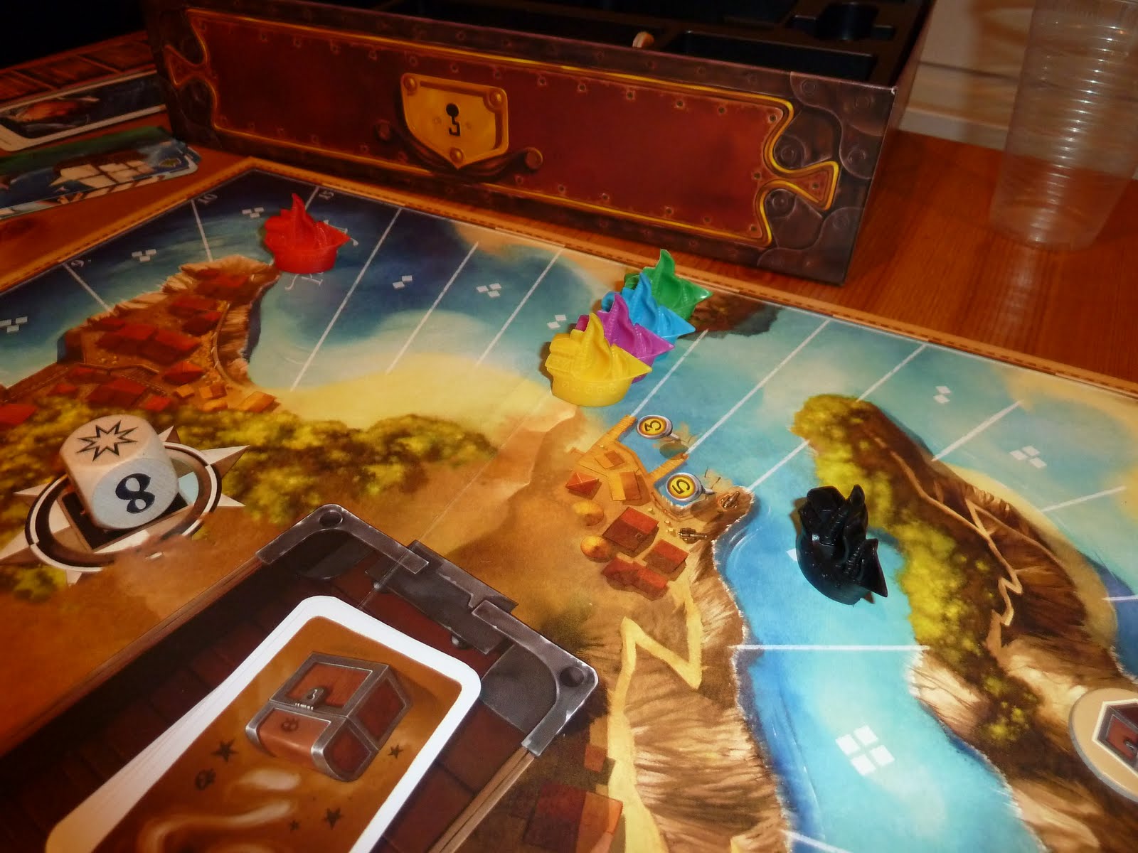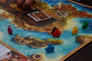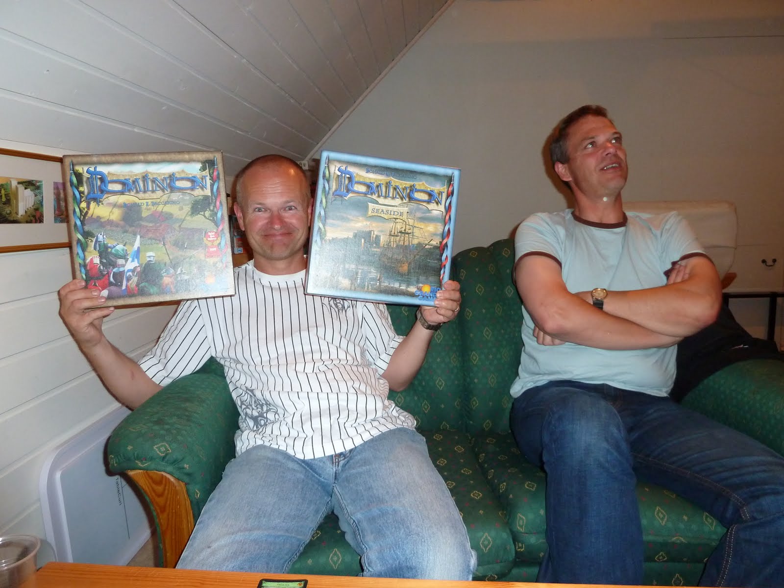 Dominion har jo ikke vært Peters beste gren, men han hadde fått litt gode tips av Hollender om å ikke kjøpe for mange action-kort uten heller satse på å øke kjøpkraften tidlig i spillet. Det som skiller Dominion Seaside fra Dominion er at visse av kortene blir værendes i to turer. Dette gav en interessant vri til spillet. Vi dro ti kort og spilte med ett oppsett der Skattkart, Fyrtårn og Sjøhekse, var de kort som fikk mest betydning. Sjøhekse er et attakkort som gjør at alle motspillere må kaste det øverste kortet i sin høg og legge et forbannelsekort som gir en minuspoeng øverst i høgen. Fyrtårnet er et kort som blir hverende i to runder. Det gir et mynt mer å kjøpe for og i den omgang det legges ut får man også en ekstra handling. Det beskytter dessuten mot attakker. Skattkartene kan, viss man har to av dem, tas ut av spill i utbytte mot fire gullkort (a tre mynter hver).