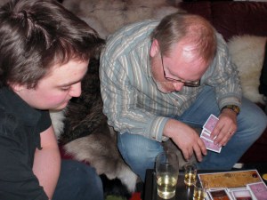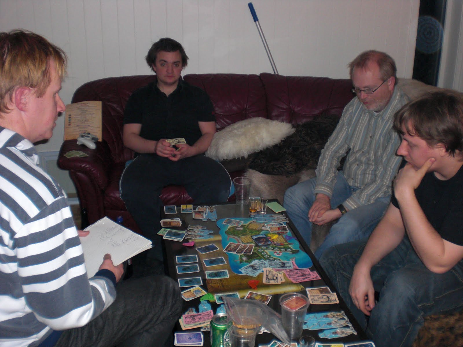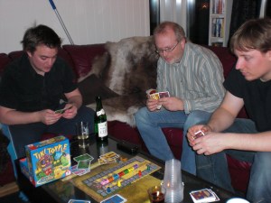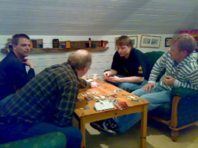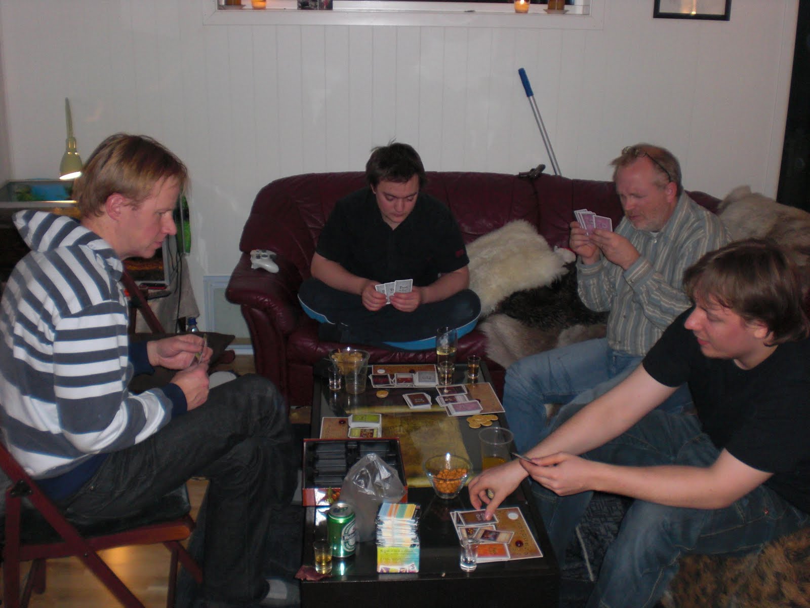 runde. Spillet ble litt vel langt da Peter trodde det gikk til 15 med 4 spillere, men det skulle gått til 12. Men vi ble i allefall godt kjent med spillets funksjon kan man trygt si. Sveinmain tok en tidlig ledelse, så kom Peter sterkt, før Vegard med hjelp av Idar kom som en vind på slutten. Det hele var helt åpent mellom Peter og Vegard før siste runde hvor Peter fikk et lykketreff og vant.