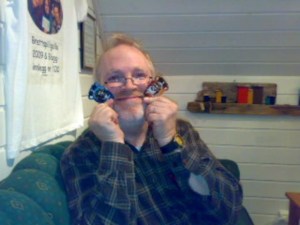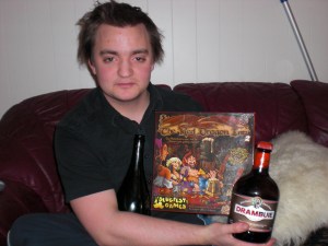 vi ble oppdaget, at damene som etterhvert har blitt allergisk mot brettspill, lot oss få lov å fullføre. Det ble Peter som hadde mest gullhår i rumpa denne kvelden, og han klarte å kaste 4×4 markterninger som åpningskast, noe som må være verdensrekord. Sveinmain slet voldsomt med å klare å nå 20 poeng, og når han klarte det så mistet han brikken rett etterpå. Robert klarte å utfordre Peter, men Peter – med kleptofingrene sine klarte stadig vekk å stjele brikkene hans. Dermed ble det en knusende seier til «Gullhårrompe»Peter. Om det var adventsduken som gjorde utslaget, eller auraen av misfornøyde damer og masende unger, er uvisst. Men som dere ser på bildet fullførte vi det hele med stil.