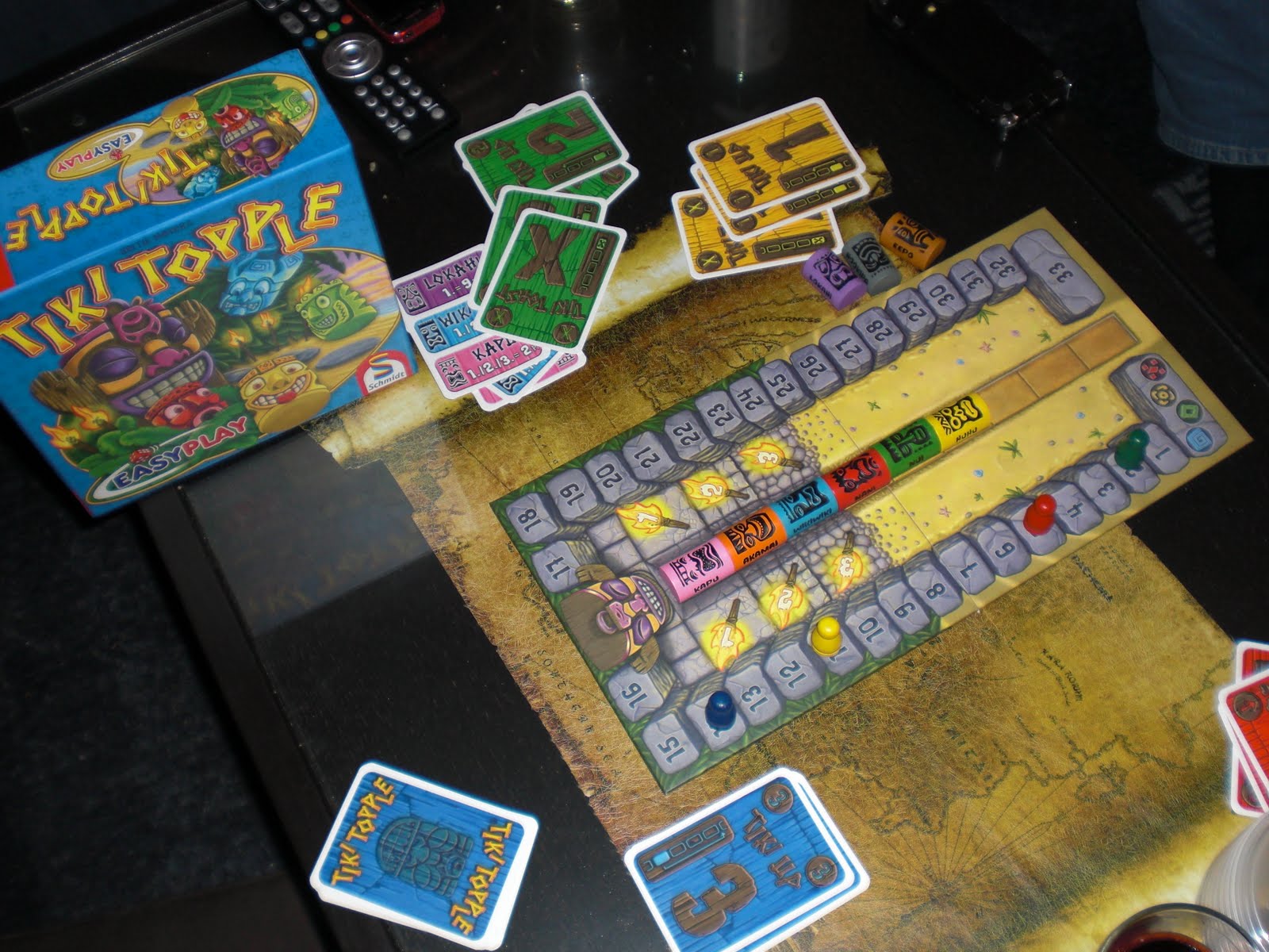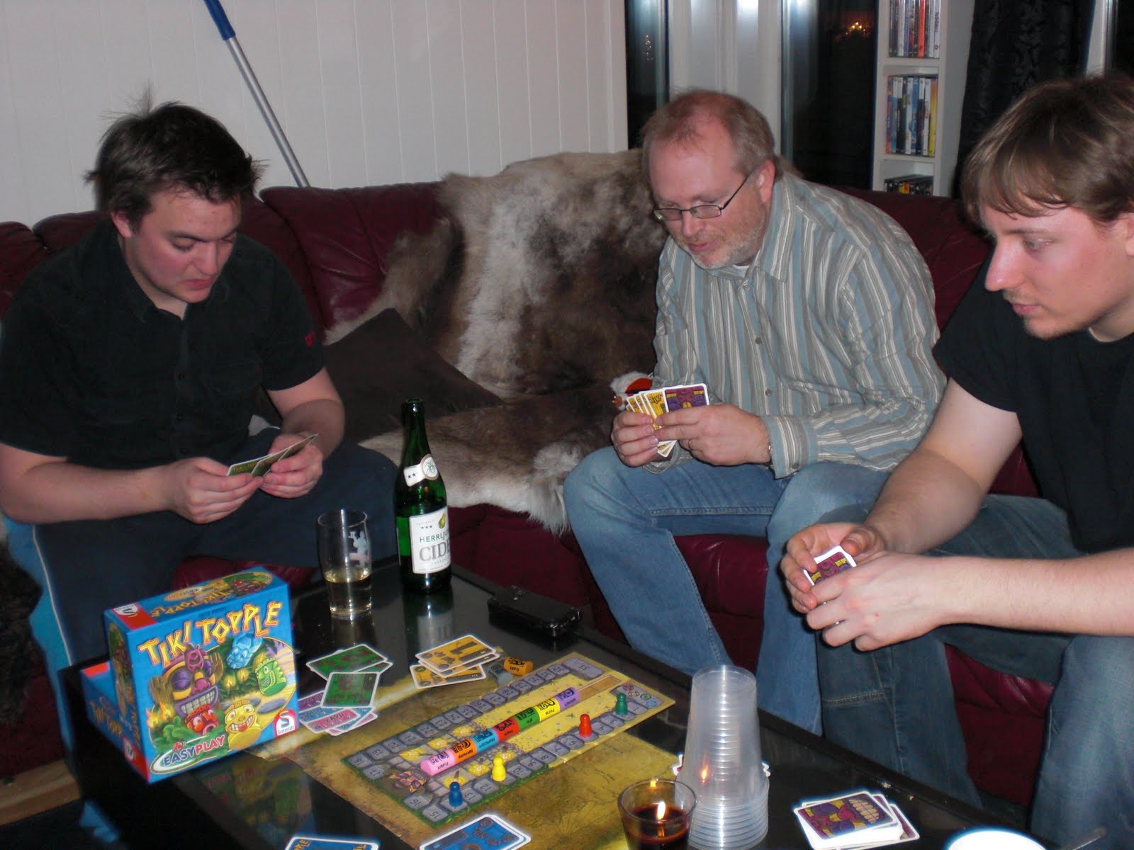 Peter imponerte: han hadde kommet hjem etter en arbeidsuke i Bergen og bare vært 15 minutter på hjemmebane. Men spilling skal det bli! Mens vi ventet på noen senkommere, entret første spill bordet. Tiki Topple ble raskt og godt forklart av Vegard, som selv startet spillet. Det ble igjen en morsom omgang med blant annet mye tiki wiki, tiki toast og tiki up. Litt taktikk og litt bløffing, samt en stor dose sabotasje. Peter ledet med 2 poeng forsprang etter tre runder og påpekte at det skulle spilles fire runder. En runde fulgte med lite hell for Peter som fikk ‘toastet’ sine stammer og endte med null poeng. Hollender fikk 5 poeng for en annen plass og passerte Peter. Samtidig passerte Pift Vegard for å unngå jumboplass.