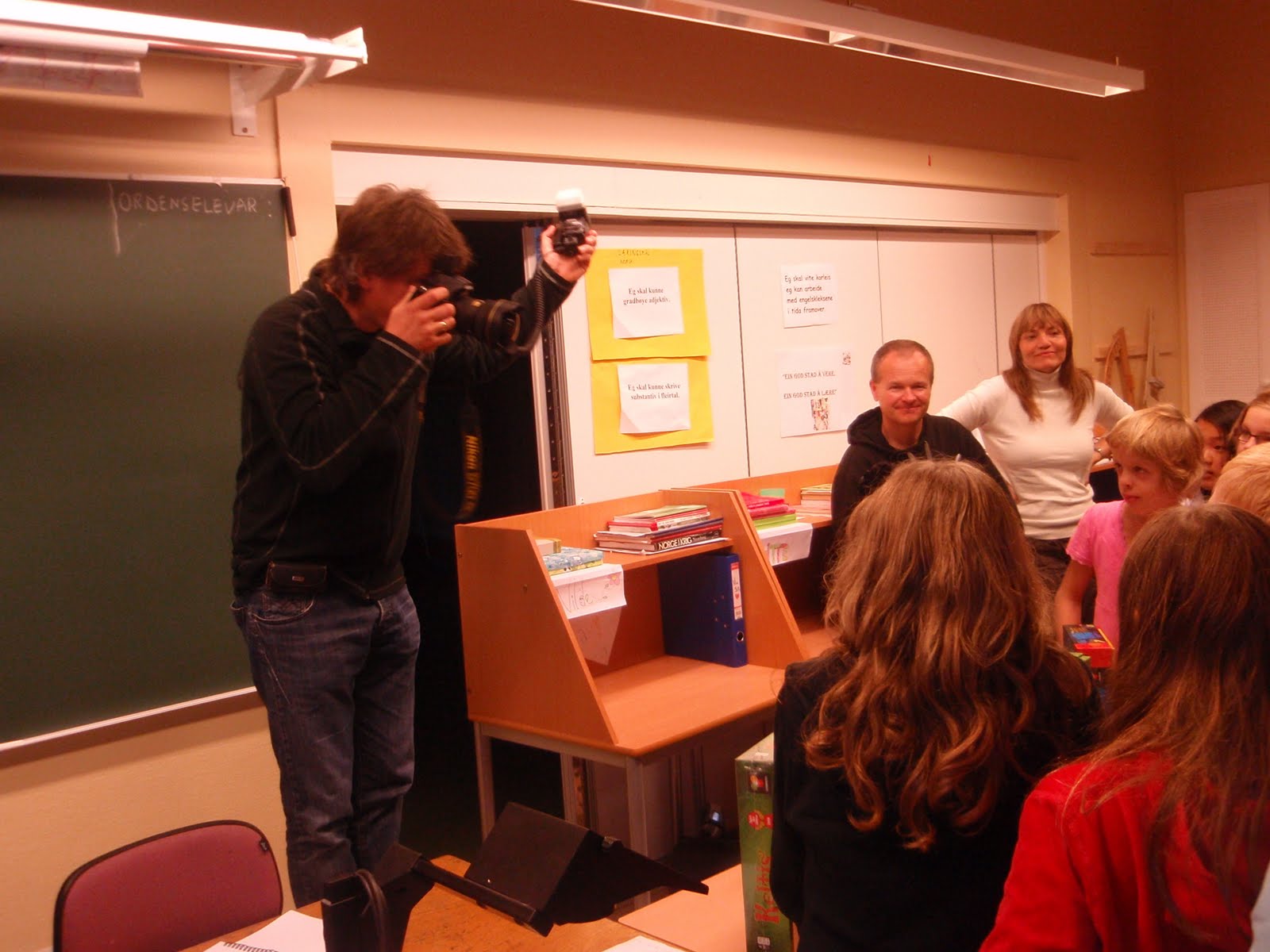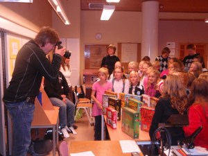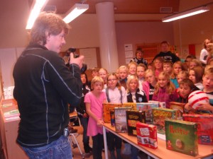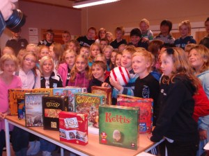 ne få for 1000 kroner. Etter en ukes tid ankom et lass med spill i PGs postboks. For å skape litt blest om brettspill og at Smarte Gaver ga disse barna såpass med brettspill, så tok vi kontakt med Aftenbladet for å prøve å selge inn ideen. Journalister biter som sagt ikke over kroken sånn helt uten videre, men PG fikk hjelp fra høyere brettspillmakter da Aftenbladet nå på lørdag kjørte en repotasje om at Data og dataspill var en viktig del av den kulturelle skolesekken, anbefalt for barn fra 3 år og oppover. Vi mente data var bra, men brettspill enda bedre, og Journalisten tok agnet, og dukket opp under utdelingen i dag til 1. time. 56 unger fikk store øyne da læreren overrakte 1000 kroner til oss i PG, og det ene brettspillet etter det andre dukket opp fra pappeksene de lå godt gjemt i. Tror det ble