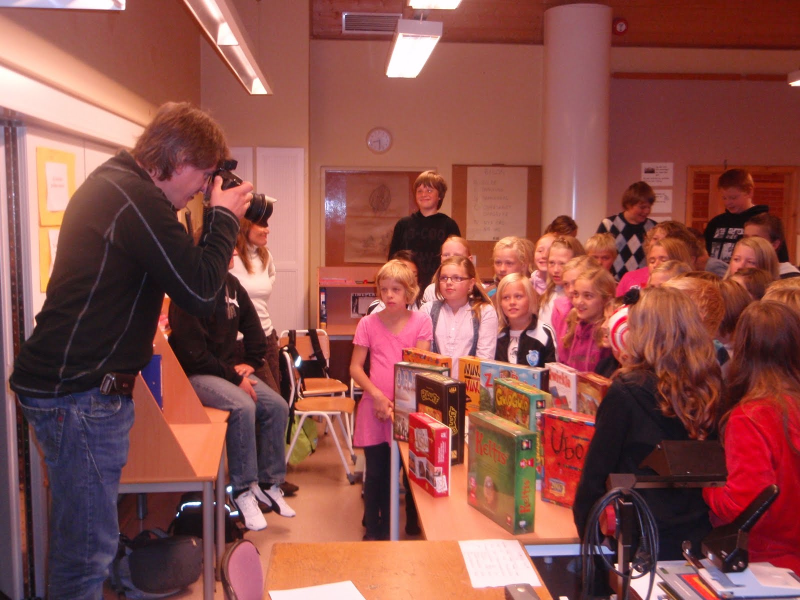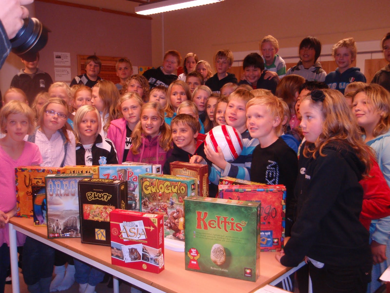 en 14-15 til sammen. Sveinmain tok den pedagogiske jobben med å vise spill for spill i plenum, i allefall de enkleste. Vett og vedding, Tablecurl, Ubongo, Qwirkle, 10 days in Asia, Zack Pack, Helihopper med flere ble vist frem og enkelt forklart. Ubongo ble dratt kjensel på av flere, mens Vett og Vedding var gutta og Journalistens favoritt. Morsomme spørsmål dukket opp som om det var ekte diamanter i Ubongo, andre lurte på om Philipinene var på 10 days i Asia-kartet. Main svarte så godt han kunne. Barna satt med store øyne og ville ha flere forklaringer, men da hadde det allerede gått en skoletime og det var på tide å begynne å spille. 56 unger satte seg ned i forskjellige klasserom og den ene lærerens RLE opplegg om Jødedommen måtte legges kjapt til side. Her var det spil