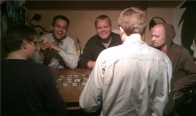 Sveinmain, og Sveinmain sa på sin side at han garantert kom til å tape dette spillet, hvor spillerne i stor grad kan styre hvem som skal trekke inn minuskortene rundt bordet, og etter 1. runde lå han sist. Som vanlig var det god stemning rundt bordet og en del Å-nei, legg på han, ikke legg på meg, og jeg som trodde jeg kunne stole på deg. Lystig og god stemning. Kortene fordelte seg jevnt, men Sveinmain prøvde eneste taktikk som funker i dette spillet: Ikke snakke for mye. Og vet ikke helt hva som gjorde det, men han trakk i allefall det lengste strået til slutt. Såpass at han måtte ta bilde av seg selv etterpå, da samtlige nektet!